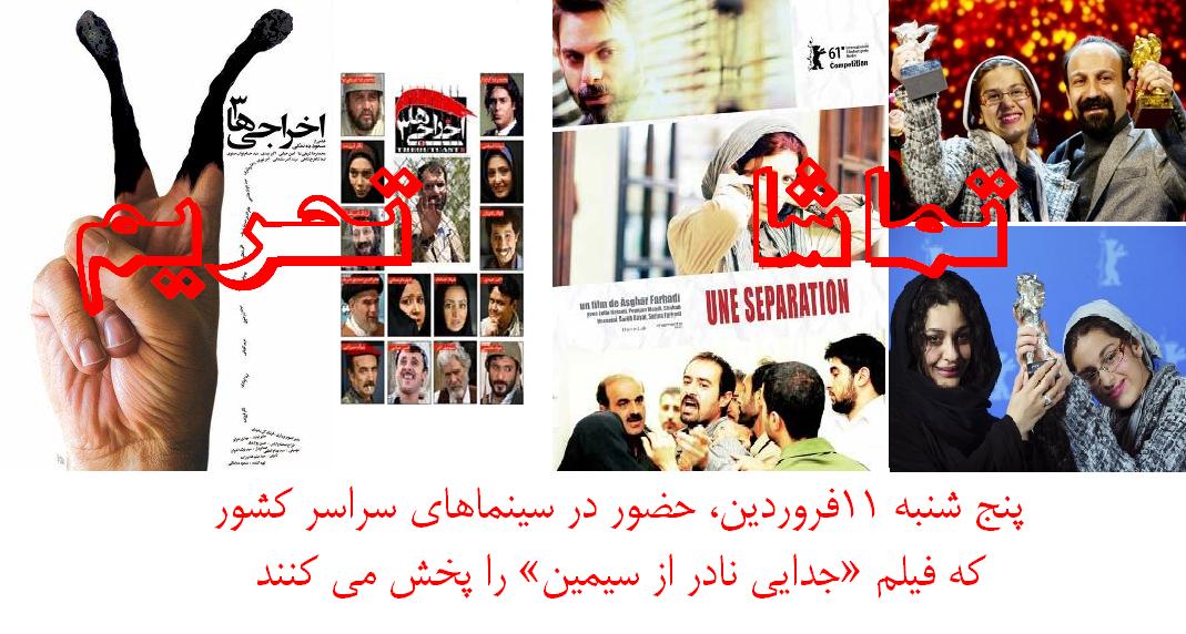 در این میان، پخش یک فیلم به نام "جدایی نادر از سیمین، که از موضوع سیاسی هم برخوردار نیست، به کارزاری تبدیل شده برای نه گفتن به فیلم اخراجی ها و طرح های ضد مردمی حکومت دیکتاتوری و آری گفتن به خواست های مردمی و هنرمندان همراه با مردم. فیلمی که در جشنواره ی برلین برنده ی جایزه ی خرس نقره ای شده و کارگردانش بر روی سن از جعفر پناهی دربند زندانهای جمهوری اسلامی یاد کرده است.